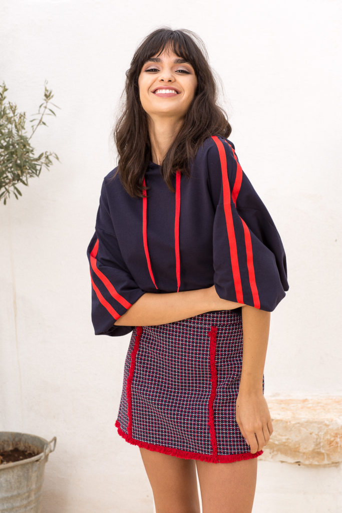 Φούτερ μπλούζα μακρυμάνικη, με κόκκινες γραμμές στο πλάι και κουκούλα.